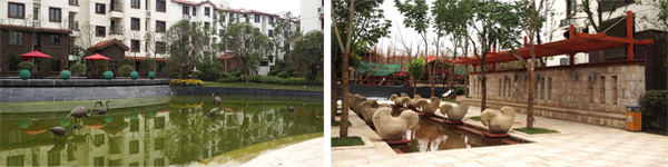 在紫荊東郡小區(qū),水景隨處可見,從主入口兩側(cè)近50米的景觀橋水景,到入口正前方一個大型的石雕噴泉,再到小區(qū)里面幾條主干道交匯的十字路口的小型地面噴泉,中心水景上的圓形石雕噴泉,特別是不遠處的動物噴泉雕塑,只只鶴低頭凝思,細長的水流從鼻端的出水口處流出,落入下方的水池里,更是格外引人注目。“這些水景小品具有的藝術(shù)特性與審美效果,加強了整個景觀環(huán)境的藝術(shù)氛圍,成為讓空間環(huán)境生動起來的關(guān)鍵因素,在提高小區(qū)藝術(shù)品質(zhì)和景觀形象的同時,更給人們帶來美的享受。”楊經(jīng)理如是說。