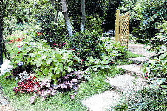 林蔭景觀 結(jié)合原有桂花,中層配植美人蕉、小葉蚊母,底層種植玉簪、落新婦、百子蓮、九頭獅子草、火炬花等,形成以粉色為主色調(diào)的林蔭景觀。