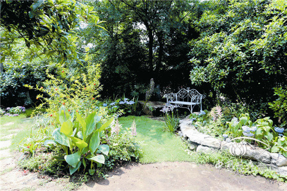 內(nèi)部八仙花花園,以櫸樹、景石、石籠擋墻及園路圍合成半開敞空間,以八仙花為主材,搭配鳶尾、石榴、落新婦、百子蓮等,組成3個(gè)花境組團(tuán),與白色座椅形成半私密的花園景觀。