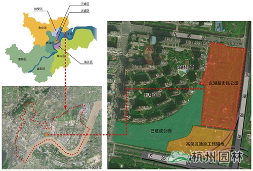 江干區東湖路市民公園位于東湖路與九喬街西南角,毗鄰九月庭院和泊林印象小區,是江干區“一帶生態功能區”的“運河—錢塘江—東湖路”U型生態軸的重要節點。結合已建成公園和高架互通施工預留地,對東湖路市民公園進行統一規劃。