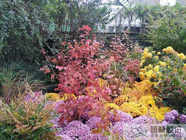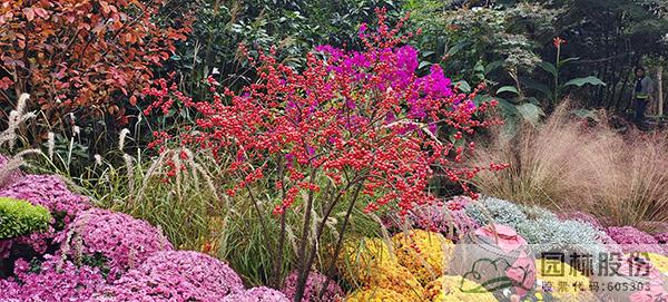 一種是未落葉的北美冬青,紅果掩映在綠色葉片中,活潑可愛(ài)。球菊和蟹爪菊都是球狀,自然舒展形態(tài)的北美冬青打破了該處單調(diào)的格局,同時(shí)也在高度上進(jìn)行了過(guò)渡。